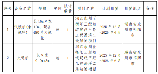 湖南省航务工程有限公司湘江永州至衡阳三级航道建设三期工程浯溪二线船闸汽渡船、交通船租赁招标公告